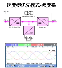 逆變器優(yōu)先運行模式(雙變換)。如下圖示,從電氣變換技術角度來看,工頻機高頻機都是采用的雙變換在線式技術,即能量經過整流器逆變器兩次能量變換后,由逆變器提供電壓精度為1%、諧波含量小于5%的正弦波交流電給負載供電。這種運行模式也可以稱為:逆變器優(yōu)先運行模式(雙變換)。