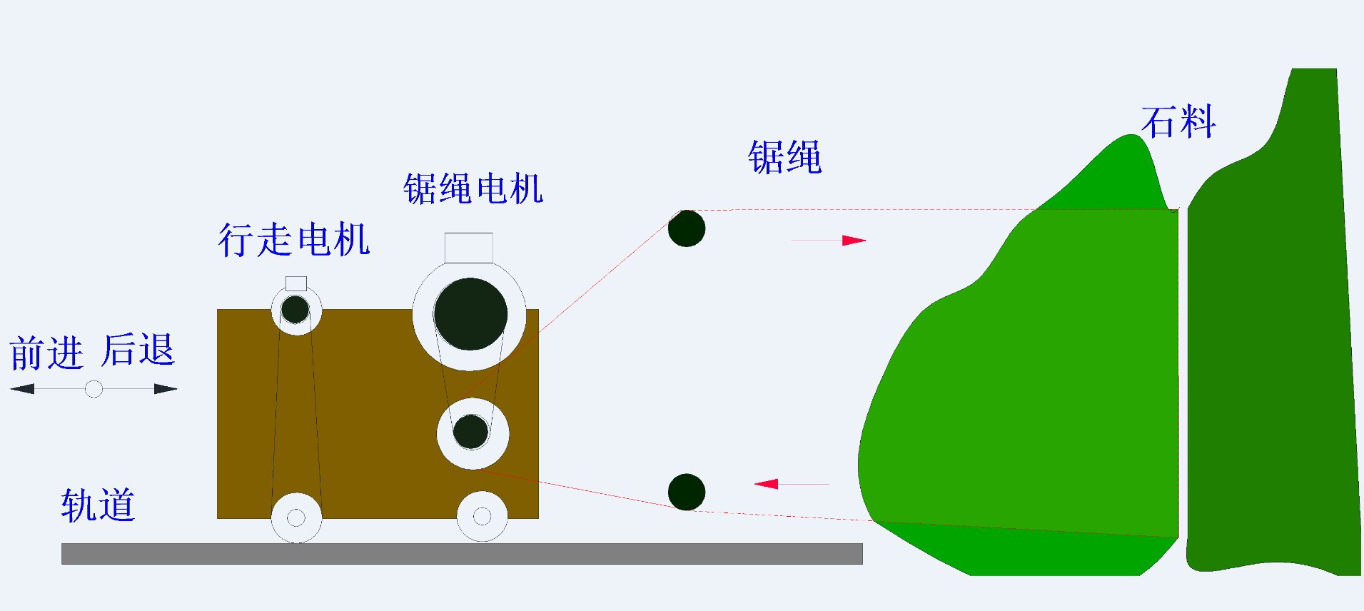 作為開(kāi)山設(shè)備的繩鋸機(jī),通常是由兩臺(tái)電機(jī)驅(qū)動(dòng)的,其中大的是鋸繩電機(jī)帶動(dòng)鋸繩,鋸繩套在已鑿出縫隙的山體上高速運(yùn)行,而小的則是行走電機(jī),帶動(dòng)鋸床沿石頭被鋸開(kāi)的方向向后緩慢前進(jìn)。可對(duì)較厚的混凝土實(shí)現(xiàn)各種切割,能保障橋梁、橋墩、碼頭平臺(tái)、水下混凝土樁的靜力切割拆除保證原結(jié)構(gòu)不受損壞。