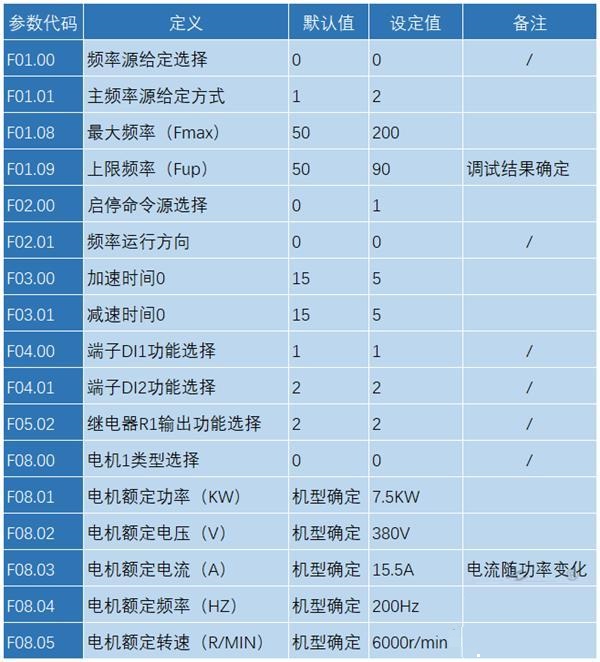 注2:以上為變頻器參數(shù)基本設(shè)置,功能詳情參考說明書;F01.09參數(shù)為調(diào)試后所確定數(shù)值,詳情請參考調(diào)試測試。