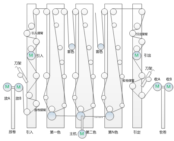 作為如今凹版印刷行業(yè)中較為普遍的控制系統(tǒng),七電機(jī)張力控制方案的系統(tǒng)構(gòu)成是由七臺電機(jī)進(jìn)行變頻傳動控制,其中兩臺分別負(fù)責(zé)放卷、兩臺負(fù)責(zé)收卷、最后由一臺主機(jī)負(fù)責(zé)控制收、放卷牽引各一臺構(gòu)成,其中收卷、放卷、收放卷牽引都是帶張力反饋的閉環(huán)張力控制,當(dāng)VFD以速度模式運(yùn)行時(shí);由于印刷單元在兩級牽引的中間,對套色精度有較高的標(biāo)準(zhǔn),因此穩(wěn)定性對張力調(diào)節(jié)來說十分重要,所以主機(jī)和兩級牽引采用帶編碼器的閉環(huán)矢量控制。其他張力控制系統(tǒng)均是在七電機(jī)張力控制系統(tǒng)的基礎(chǔ)上進(jìn)行增加或減少電機(jī)構(gòu)成的。